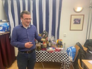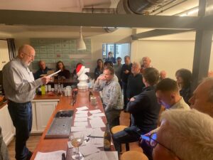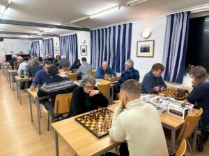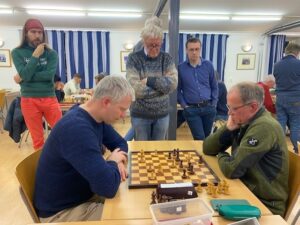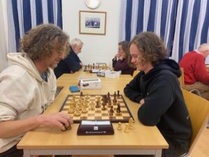 Na vier spelen wist barman Kees Stap meteen heerlijke oliebollen, appelflappen en glühwein klaar te hebben. Hiermee konden alle schakers in teams van vier een schaakquiz oplossen welke rekenwerk, bijnamen van schaakpartijen, mat puzzels en een heuse schaakkleurplaat bevatte. Er bleek maar een team in staat om de ongebruikelijke kleurplaat in te kleuren. Daarna kregen alle deelnemers een prachtig kerstverhaal te horen van de hand van Jan Blom. Met een inventieve politieke twist wist Jan de roerige politieke situatie weer eens tot een goed einde te brengen in zijn 30ste kerstlezing. Chapeau Jan!