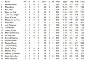 Hidde wint de 13e editie van het Wageningen studentenkampioenschap met een score van 5 uit 6. Het werd in de laatste ronde uiteindelijk een werkelijke titelstrijd. Hidde wist met een winst in de laatste ronde op Niels van Duijl op weerstandspunten bovenaan te eindigen. Hidde kon echter langszij komen omdat Maria Ibarz in de laatste ronde wist te winnen van de, tot dan toe, ongeslagen Rex Yang. Toeschouwers werden getrakteert op een prachtig schaakspekstakel waar tot het laatste moment gestreden werd om de felbegeerde eerste plek. Hidde Hanning trok dus uiteindelijk aan het langste eind en werd voor het eerst gekroond tot winnaar van het Wageningse studentenschaaktoernooi. Maria Ibaraz behaalde een eervolle 2e plaats en ook Rex Yang werd uiteindelijk waardig derde met ook allebei een score van 5 uit 6. Hidde, Maria en Rex verloren alleen van elkaar. Niels van Duijl, Jules van Dungen, Bram Wiebes en Moos van der Veen kwamen allemaal net naast het podium terecht met toch een mooie score van 4 uit 6.